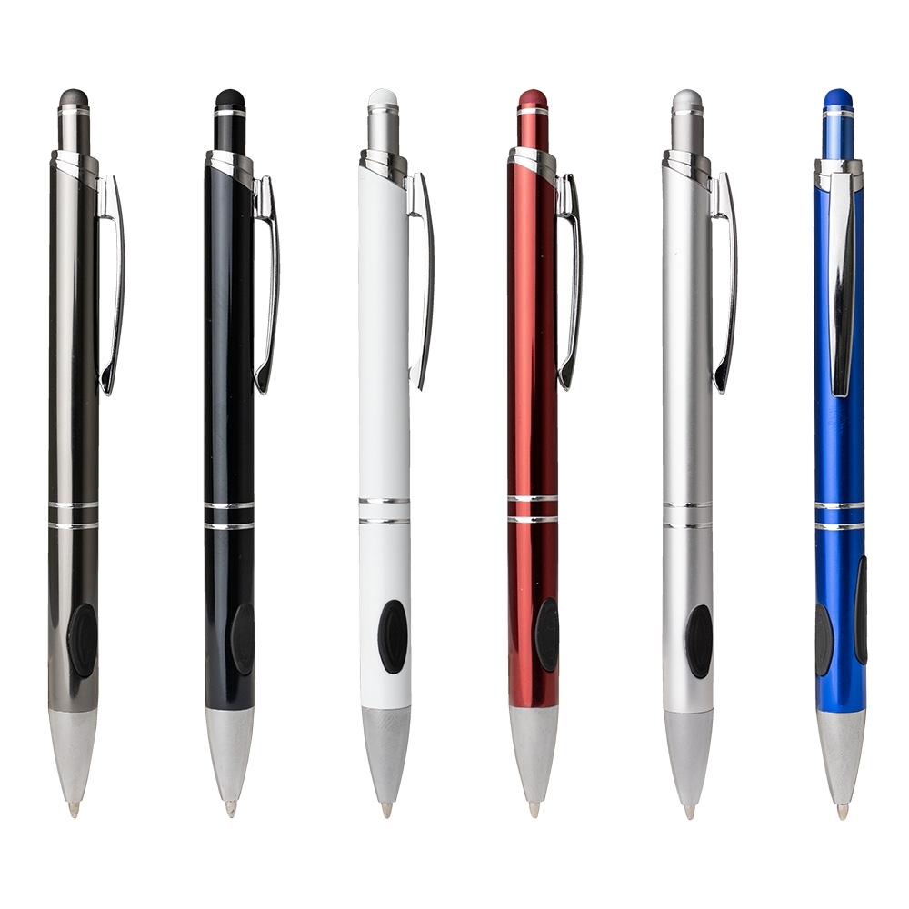 Caneta metálica touchscreen com acabamento emborrachado, acionamento por clique e carga esferográfica azul 1.0mm.